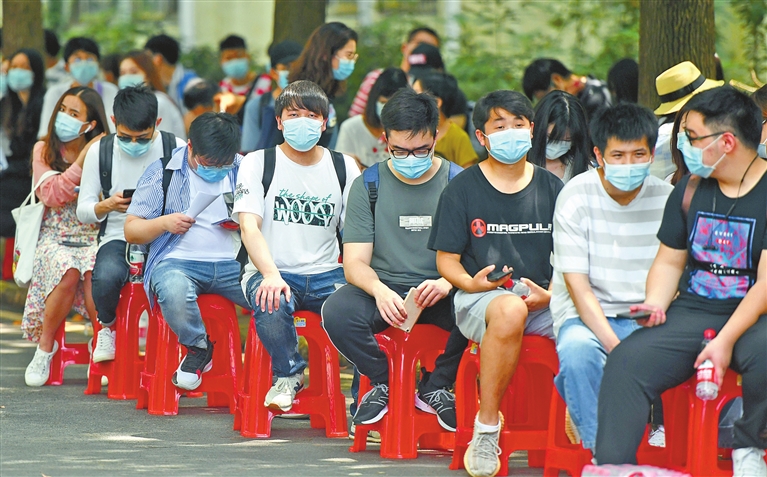 | | College students wait to enter a job fair yesterday in Jianghan University in Wuhan, the capital city of Hubei Province previously hard hit by the novel coronavirus. More than 80 companies offered about 10,000 posts for college graduates at the city’s first offline job fair since the COVID-19 outbreak. Xinhua |