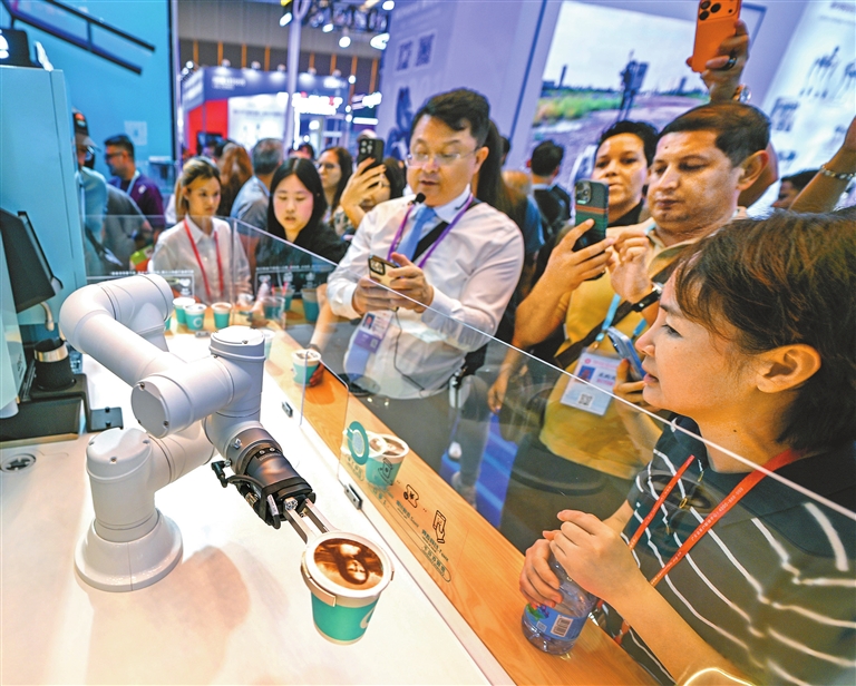 | Visitors watch a coffee‑making robotic arm at Shenzhen‑based DH‑Robotics’ booth during the 138th Canton Fair in Guangzhou on Thursday. More than 1,370 Shenzhen-based companies are taking part in the fair, occupying over 3,000 booths. On the fair’s opening day Wednesday, Shenzhen exhibitors closed deals worth US$115 million, four times the amount recorded on the first day of last autumn’s fair, the city’s commerce bureau said. The fair will run through Nov. 4. |