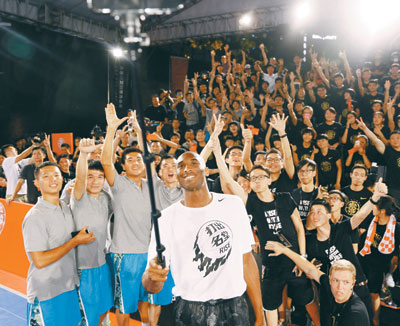 NBA Star Kobe Bryant (C) make a selfie with fans in Guangzhou on Saturday. Kobe Bryant arrived in Guangzhou on Saturday, beginning his trip of Guangzhou, Shanghai and Taipei in China from Aug. 1 to Aug. 6.SD-Agencies