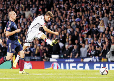 Thomas Mueller scored twice and set up the other for Germany in Glasgow and move within touching distance of automatic qualification.