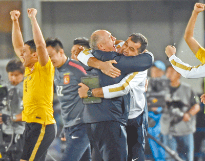 Luiz Filipe Scolari (C), coach of China’s Guangzhou Evergrande Taobao, celebrates with his team in Osaka, Japan, yesterday. His team reached the AFC Champions League final for the second time in three seasons after they drew 0-0 against Gamba Osaka last night. The win handed the Chinese side a 2-1 aggregate triumph over the Japanese treble winners. Xinhua