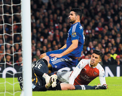 Per Mertesacker was sent off for tripping Diego Costa, then the striker scored the game’s only goal at the Emirates Stadium in the 23rd minute.