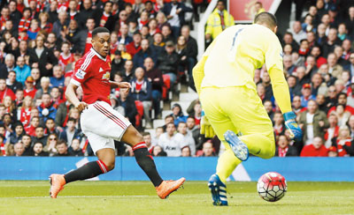 ANTHONY MARTIAL scored the winner as Manchester United beat Everton 1-0 at Old Trafford to keep its top four hopes alive.