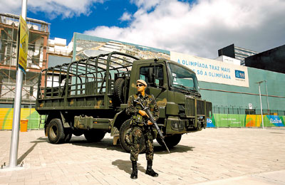 A soldier of the Brazilian Army Forces stands guard outside the 2016 Rio Olympics Park in Rio de Janeiro, Brazil, on Monday. Brazil has tightened security but its new security norms which began Monday have been causing massive queues at the country’s main airports. SD-Agencies