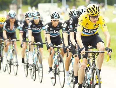 Wearing bandages on his right knee and elbow for Saturday’s stage, Froome was never in trouble as his top lieutenants at Team Sky escorted him up and down each of the day’s four climbs.