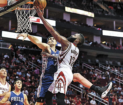 JAMES HARDEN scored 23 of his 33 points in the first quarter, and the Houston Rockets cruised to a 115-88 win over the Philadelphia 76ers Monday night.