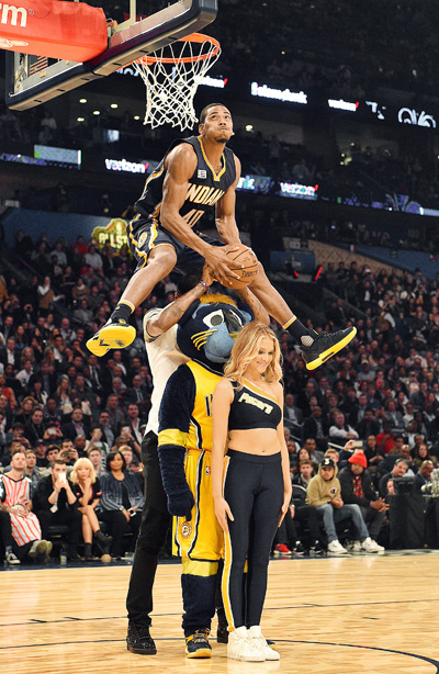 GLENN ROBINSON III is the NBA’s new dunk king, with an assist to Indiana teammate Paul George, the Pacers’ mascot and a Pacers cheerleader.