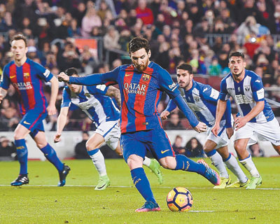 LIONEL MESSI scored a 90th-minute penalty for his second goal of the night to give Barcelona a 2-1 win over lowly Leganes in the Spanish league Sunday.