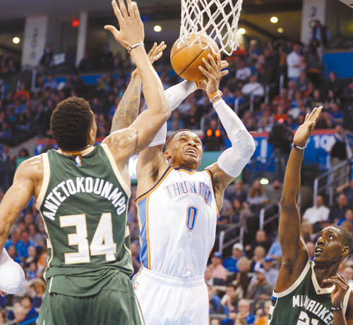 OKLAHOMA City Thunder point guard Russell Westbrook matched Oscar Robertson’s single-season record with his 41st triple-double Tuesday night. The home crowd stood and chanted “MVP! MVP!” long after the assist, and he later waved to the crowd after play stopped . “It’s one of those nights, a special night, and something I definitely will never forget,” he said. “I’m just truly honored to do it here, especially in Oklahoma City.” Westbrook finished with 12 points, 13 rebounds and 13 assists to help the Thunder beat the Milwaukee Bucks 110-79. He clinched his seventh straight triple-double on an assist to Taj Gibson with 9:17 left in the third quarter. “An honor to just be mentioned in a conversation with Oscar Robertson, the different things he did for the game of basketball to allow me to play the game today,” he said. Robertson set the record during the 1961-62 season, and Westbrook can break it in Memphis. Westbrook said he just wanted to focus on the moment, yet his mind raced ahead to someday telling his unborn son about the experience. “It’s something that I could never dream about growing up in the inner city of Los Angeles,” he said. “I never dreamed about a moment like this, to be able to be on this stage.” Westbrook also moved into a tie with Wilt Chamberlain for fourth on the career list with his 78th triple-double. Bucks coach Jason Kidd, who is third with 107 triple-doubles, was impressed with Westbrook’s ability to dominate without scoring as much as usual. Westbrook, the NBA’s scoring leader, made just four field goals. “He didn’t have to score 40 tonight to help them win,” he said. “It showed that he was sharing the ball, and everybody was benefiting from that.” Enes Kanter scored 17 points for the Thunder, who posted their largest victory margin of the season. Michael Beasley scored 14 points and Giannis Antetokounmpo added 11 points and 10 rebounds for the Bucks. Milwaukee had been one of the league’s hottest teams. Kidd was voted Eastern Conference Coach of the Month after leading the Bucks to a 14-4 record in March, and though they lost to Dallas on Sunday, their recent success gained the Thunder’s full attention. Westbrook had 12 points, eight rebounds and eight assists at halftime to help Oklahoma City take a 63-39 lead. He hit a 3-pointer with 8.6 seconds left in the first half to reach double figures in points. Westbrook got his 10th rebound and 10th assist six seconds apart. He left the game for good with 2:35 left in the third quarter. “You could feel in the building, and you could see that his teammates were not going to let him down tonight,” Kidd said. (SD-Agencies) |
