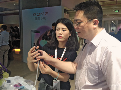 Xie Wenjuan (L), UI director of the smartphone software development department of Gome, one of China’s major home appliance retailers, explains the iris function on a Gome K1 smartphone to a visitor at the company’s Gome smartphone marketing fair in Shenzhen on Friday. Gome unveiled Friday China’s first smartphone featuring iris scanner technology. With the K1 series, Gome, a latecomer to the smartphone market, aims to snatch a market share of the mid-priced segment of the already fierce home market that is dominated by Huawei, Oppo, Vivo and Xiaomi.Cathy Mo |