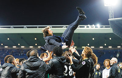 With the score tied 0-0 still late in the first half, Chelsea fans cried foul when the referee failed to call a handball after West Brom’s Jonny Evans used his left hand to win the ball for which he and Chelsea star Cesc Febregas had been vying. The infraction wouldn’t go on to make a difference in the game’s outcome, however, thanks to Michy Batshuayi, who came on for Chelsea’s star forward Eden Hazard late in the second half. Batshuayi’s teammate Cesar Azpilicueta came through first with an impressive assist. Batshuayi wound up an unlikely hero, having played a total of just 127 minutes this season so far, according to Squawka. The Belgian national has been remarkably efficient within that short window, however, having scored twice, including his title-clinching shot Friday. “It’s the best moment in my football career,” Batshuayi said after the match, according to Belgian journalist Kristof Terreur. While Batshuayi soaks up the excitement Friday, many more are crediting Chelsea Manager Antonio Conte for whipping the team into shape after a sorry 2015-16 season that saw Chelsea place a disappointing 10th. “The changes Conte has made to change their season around can’t be underestimated,” former England midfielder Jermaine Jenas told the BBC on Friday. “When their backs have been against the wall tonight, they defended well. This game typified Chelsea’s season. How many winners they have in their team makes them special. But tactically, individually, what Conte has done with these players and to bring them together is sensational.” Conte didn’t hold back his joy when Batshuayi sent the title-clinching goal in, celebrating wildly on the sidelines with some of Chelsea’s staff. With two games now left in the season, Chelsea will basically be on an extended victory lap. Win or lose, the team can’t be caught in the Premier League rankings, where it sits atop the leader board with 87 points. Chelsea’s closest competitor this season, Tottenham, is in second with 77 points. With its sixth top-flight title and fifth in the Premier League era, Chelsea is the second-winningest team in English soccer history. Manchester United remains the winningest, with a whopping 13 Premier League titles. For a club that can be toxic and leaky, there have been few flashpoints this season in the first year under Conte. “When you arrive after a bad season, 10th place, it means there are a lot of problems, not only one,” Conte said. “To find the right solution quickly wasn’t easy. For this, I want to say thanks to my players; they trust in a new work, in a new philosophy, a new football, new analysis, the mistakes, the positive and negative situations.” (SD-Agencies) |