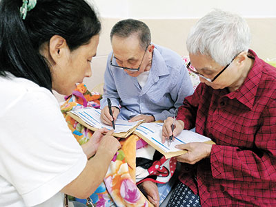 Veteran Xu Zhongcheng (C) and his wife sign agreements to donate their organs after death with help from a coordinator of the Shenzhen branch of Red Cross Society of China at a seniors’ home in Shenzhen during the National Day holiday. The couple followed their children to settle in Shenzhen in the early 1990s. Xu joined the army when he was only 18 years old and fought in the War Against Japanese Aggression. Zhang Yan |