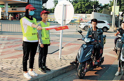 Xiaog Meiwei (L) and her son, Tan Haoran, wearing volunteer vests, guide traffic at the intersection of Beihuan Boulevard and Huanzhen Road in Shajing, Bao’an District on Sunday morning. Xiong’s husband, Tan Guangxian, was also at the road section doing volunteer service. Chen Ximin |