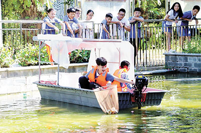 Students from Shenzhen Yadi School set sail in a new-energy cleaning boat they produced on their campus in this July file photo. The new-energy cleaning boat stood out from a number of entries from schools around the world to become one of the 16 shortlisted entries for this year’s Zayed Future Energy Prize. The Yadi school is the first in China to be shortlisted for the prize, said to be the world’s most important prize in environment protection. Yu Lijie |