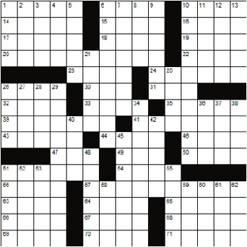 Across 1. Surpass 6. Air force heroes 10. 20th-century art movement 14. Got up 15. Lake (Scottish) 16. Nile bird 17. Steam bath 18. Ancient Peruvian 19. Drunkards 20. Typographer 22. Ballet attire 23. Tall woody plant 24. Anagram of “rioted” 26. Travel on water 30. A large vase 31. Lair 32. Annul 33. Felines 35. He plays a role 39. Refuse to do business with 41. Carrying boats overland 43. Beauty parlor 44. Biblical kingdom 46. Former Italian currency 47. Muck 49. Anagram of “ail” 50. The original matter 51. Levy 54. Liturgy 56. Encircle 57. The climax of a drama 63. 62 in Roman numerals 64. Send forth 65. 3-banded armadillo 66. Greek liqueur 67. 3 times 3 68. Risk 69. Not closed 70. Labels 71. Be Down 1. Where the sun rises 2. Roentgen ray 3. Masterstroke 4. Feudal worker 5. Not the most 6. Uneducated person 7. Carefree 8. Behold, in old Rome 9. Distributed equally 10. Clearly 11. More or less 12. Repeat 13. An ancient Assyrian city 21. Spew 25. Costly 26. U-boats 27. Dwarf buffalo 28. Bucolic 29. Movement 34. Pillages 36. A dog wags one 37. Monster 38. 500 sheets 40. Burden 42. Leaves out 45. Dashing 48. Fair 51. Snow house 52. Confusion 53. Award 55. French for “storehouse” 58. Dogfish 59. Pinnacle 60. Indian dress 61. Colored part of an eye 62. Sodium chloride |