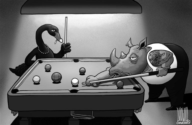 A black swan and a gray rhino.