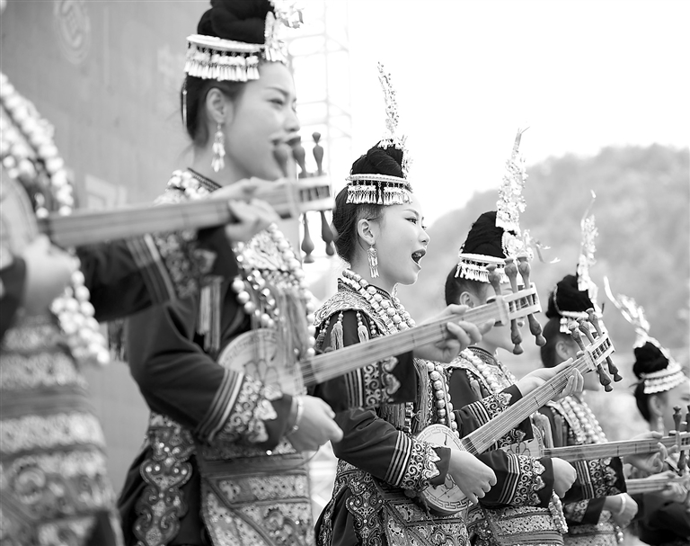 Performers in ethnic costumes sing at the 2nd China Danzhai Intangible Cultural Heritage Week that was held in Danzhai County, Guizhou Province’s Qiandongnan Miao and Dong Autonomous Prefecture, yesterday. Xinhua