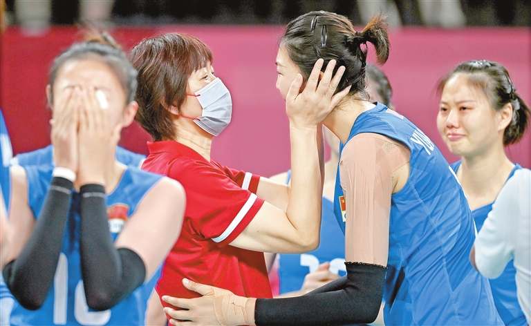 Lang Ping, head coach of the Chinese women’s national volleyball team, holds a player’s face in her hands while some tearful others look on after China defeated Argentina 3-0 in their last preliminary match at the Tokyo Olympics yesterday. Defending champion China was knocked out of the game despite two wins, after suffering three straight losses earlier. Lang has confirmed that she will retire after the Olympics.Xinhua |