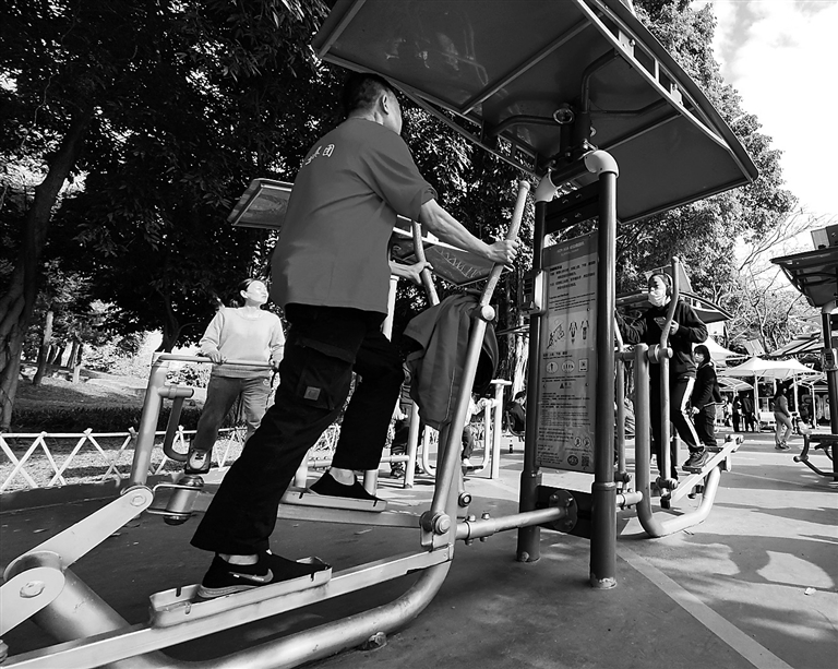 Residents exercise at an outdoor smart gym in Shenzhen Central Park in Futian District yesterday. The gym is free to use, and people can scan QR codes on the gym’s facilities to generate their physical test reports and record their own exercise data. The gym’s facilities were quite popular during the seven-day Spring Festival holiday, the municipal urban management authority said. Shenzhen’s public parks are getting smarter in recent years as smart applications and facilities have been set up to provide residents with a wide range of convenient services. Sun Yuchen |