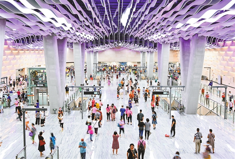Passengers are seen at the Rainbow Bridge Metro station of Line 8 in Guangzhou yesterday. Covering an area of 86,000 square meters, the new metro station opened to the public yesterday. China News Service