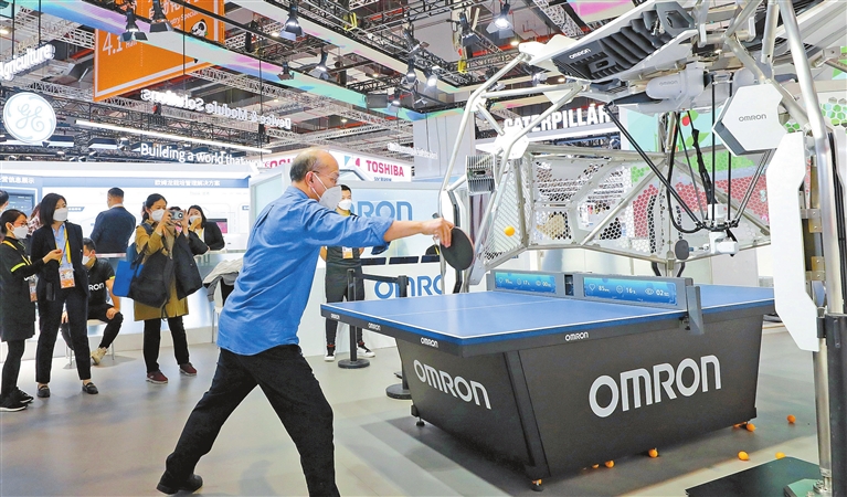 A man plays against table tennis coaching robot FORPHEUS developed by OMRON during the ongoing 5th China International Import Expo at the National Exhibition and Convention Center in Shanghai on Sunday. The company is exhibiting its 7th-generation robot table tennis tutor at the expo that will run through Thursday. More than 280 Fortune 500 companies and industry-leading enterprises from around the world are participating in the expo. Xinhua |