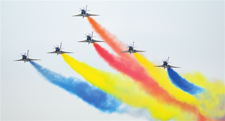 Aircraft of the Bayi Aerobatic Team perform at the 14th Airshow China that opened in Zhuhai, Guangdong Province, yesterday. More than 740 enterprises from 43 countries and regions are participating in the show both online and offline. The J-20 stealth fighter jet, China’s top combat aircraft, is on display for the first time, along with a number of domestic civil aircraft and unmanned aerial vehicles. The air show will run through Sunday. China News Service |