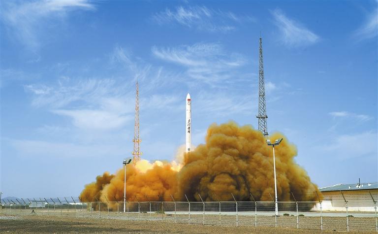 An SQX-1 Y10 commercial carrier rocket carrying a satellite blasts off from the Jiuquan Satellite Launch Center in Northwest China yesterday. The rocket blasted off at 12:11 p.m. Beijing Time from the launch site, sending a satellite into its planned orbit. Xinhua |