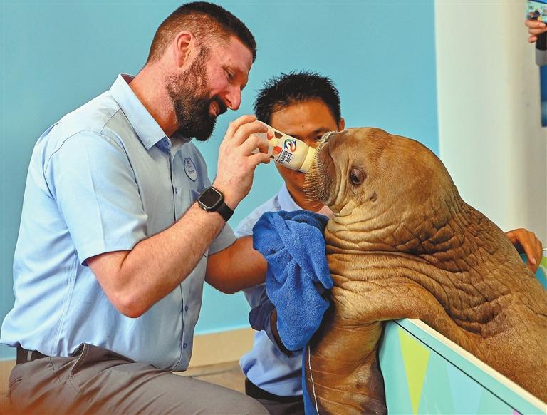 A staffer feeds a male Pacific walrus calf nicknamed “Wo Wo” at the Chimelong Ocean Kingdom in Zhuhai, Guangdong Province, yesterday at a celebration marking the pup’s 100-day milestone. China’s first artificially reared Pacific walrus calf, Wo Wo was born June 8 but was rejected by his mother, who failed to exhibit normal maternal imprinting. Chimelong’s veterinary team raised him on a specially formulated diet combining killer whale milk, milk from other walruses, and a custom-made powdered substitute. In 100 days, the pup has grown from 56 kg to more than 100 kg.China News Service |