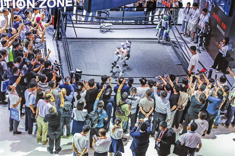 Visitors watch a boxing match between two Unitree humanoid robots Thursday at the fourth Global Digital Trade Expo (GDTE) in Hangzhou, Zhejiang Province. Under the theme "Witness an Innovative Future," the five-day event, which concludes today, spotlights the integration of artificial intelligence (AI) across exhibitions, conferences, competitions and investment‑and‑financing services. The 2025 expo has drawn participants from 154 countries and regions and 33 international organizations, and features 1,812 exhibitors, including 381 international companies. Xinhua |
