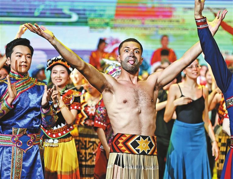 Chinese and international performers take a bow after rehearsing before the opening of a touring production of the 13th China International Folk Arts Festival at the Xixiang Auditorium in Bao’an District, Shenzhen, last night. The festival, launched last week in Foshan, features troupes from 13 countries across five continents, with performances scheduled in Shenzhen, Zhuhai, and Dongguan. Established in 1990, this large-scale cultural exchange is held every three years.Liu Xudong |