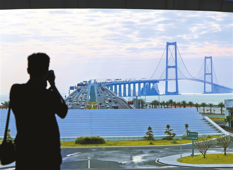 A visitor photographs the Shenzhong (Shenzhen-Zhongshan) Bridge, a key part of the Shenzhong Link, from the viewing platform on the link’s West Artificial Island, which opened for trial tourism operations Saturday. Covering 137,000 square meters — equivalent to 19 soccer fields — the island operates in trial mode until its official opening in December. During this period, group reservations are accepted on weekdays, with weekend visits open to the general public. Tickets, priced 188 yuan (US$26.4 ) for adults, and reservations are available via the WeChat mini-programs “深爱票,” “深中跨市公交专线,” or “香山畅行.” Group bookings can be arranged through the WeChat official account “深文旅发展.” Xinhua |