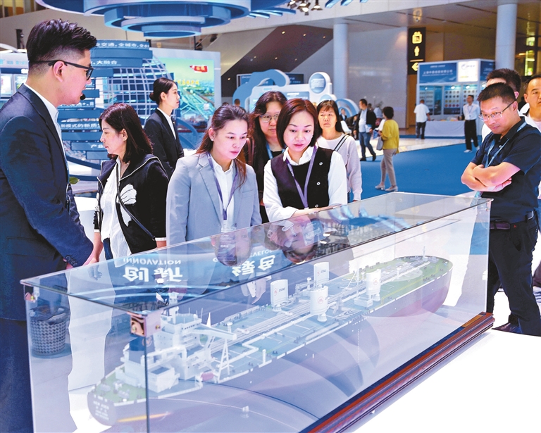 Visitors gather around a ship model at China Merchants Group’s booth during the 2025 China Marine Economy Expo, which opened at the Shenzhen World Exhibition & Convention Center in Bao’an District yesterday. The expo will last through Thursday. P3>Li Zhong |