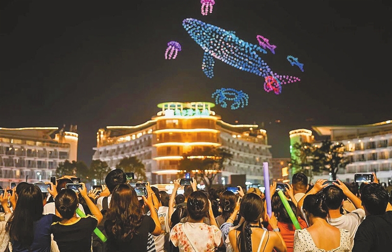 DAMEISHA Seaside Park’s main lawn hosted a spectacular offshore drone show that lit up Yantian’s sky on the night of Oct. 11. A total of 2,000 drones rose in unison over the sea, painting the sky with synchronized light and motion as a blend of technology, art, sport, and romance unfolded above the waves. Organizers say the performance featured a series of striking scenes — from the poetic “Sunrise at Shatou, Moon Over the Cape” mosaic to cinematic sequences such as “Undersea World” and “Great Ship Sets Sail.” The luminous formations were designed for maximum visual impact and became a must-shoot moment for social feeds.(Lian Jiaqi) |