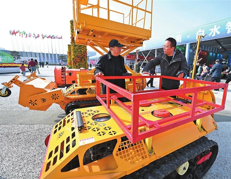A visitor inquires about a crawler-type air-assisted sprayer on display at the 32nd Yangling Agricultural High-tech Fair on Oct. 26. The five-day event, held in the Yangling Demonstration Zone, Shaanxi Province, concluded yesterday, showcasing the latest agricultural innovations and fostering international cooperation. Through events such as agricultural robot competitions and smart machinery exhibitions, the expo brought together research teams and companies from across the country to display the latest achievements in smart agriculture.Xinhua |