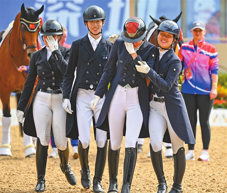 THE equestrian events of China’s 15th National Games commenced yesterday at the Shenzhen Guangming International Equestrian Center, with the Shanghai team clinching the first gold medal in the team dressage event — the first gold medal awarded at the venue after the Games opening ceremony. Held in the center, the nation’s largest-span timber structure sports building nestled against a backdrop of lush mountains, the 10-day equestrian competition will see the nation’s top riders and their horses compete. The competition features three disciplines: dressage, eventing, and jumping, with each awarding both team and individual medals for a total of six golds. Yesterday was dedicated to team dressage, which also served as the qualifier for the individual dressage event. The Shanghai team, comprised of Xu Mofei, Gu Zhanzhao, Rao Jiayi, and Wu Yue, demonstrated formidable skill and consistency to secure the top spot on the podium. The Xinjiang and Guangdong teams took the silver and bronze medals, respectively. Notably, the victorious Shanghai squad is one of the youngest in the field, with an average age of just 20.25 years. Among them, 17-year-old Xu delivered a standout performance, tying for first place individually with a score of 69.294. Her teammate, 17-year-old Gu Zhanzhao, followed closely in fourth place with 68.147 points, while Rao and Wu placed within the top 15. This victory marks a significant achievement for the young team. Wu, at 20, was the only member who has previously participated in the National Games, having won bronze in the team dressage event during the 14th Games. The Guangdong team, which has retained its gold medal-winning lineup from the 14th National Games, was unable to defend its title on home turf. Veteran rider Gu Bing, a double gold medalist in the team and individual dressage events at the 14th Games, scored 66.765 in his first outing. “The new generation of Chinese equestrian talent has grown up,” Gu Bing remarked after his ride. “The young riders are very capable. They are the future of Chinese equestrian sports. However, in equestrian events, you never know the outcome until the very last moment. I very much look forward to the upcoming individual competition,” he added. (SD News) |