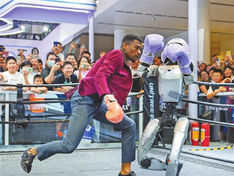 Adoko Emmanuel Blankson, a Ghanaian student from the Harbin Institute of Technology, Shenzhen, boxes with a robot during a visit to the 27th China Hi-Tech Fair, which concluded at the Shenzhen World Exhibition and Convention Center in Bao’an District yesterday. A group of international students visited the fair, getting a hands-on crash course in a future of automation and AI. P2, 3>Lin Jianping |