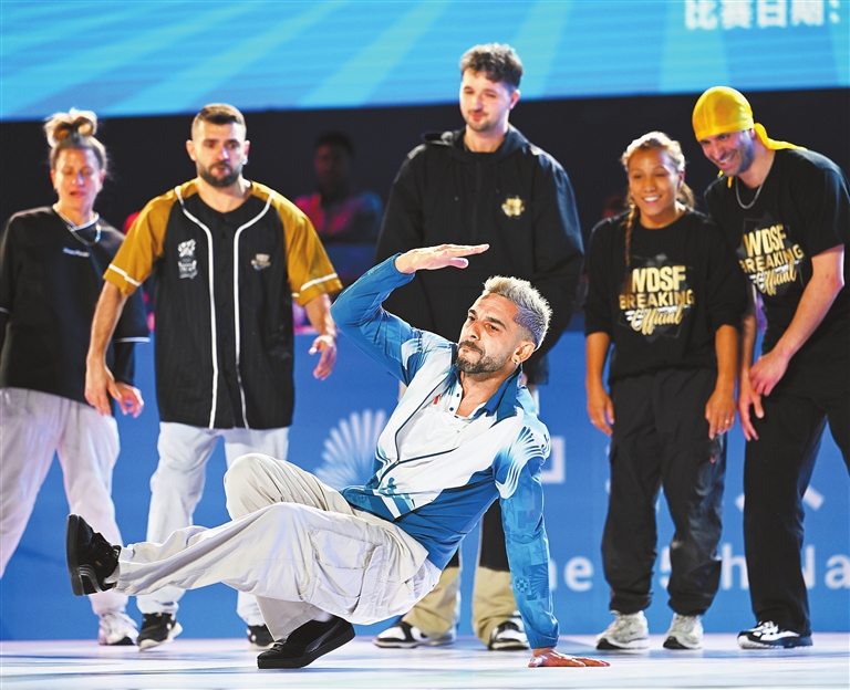 Judges perform before the start of the men’s breakdancing elimination round at the 15th National Games in Guangzhou, capital of Guangdong Province, yesterday.Xinhua