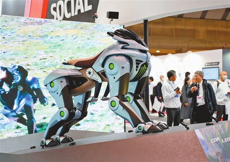At Tokyo Big Sight convention center on Friday, the CORLEO – a novel four-legged off-road personal mobility vehicle developed by Kawasaki Heavy Industries – draw crowds of curious visitors. The four-day International Robot Exhibition (iREX) 2025 concluded at the venue Saturday. The exhibition brought together more than 670 companies and organizations from countries and regions including Japan, China, South Korea, the United States, and Germany. AI-integrated robots – from advanced industrial and service models to meal-delivery and companion robots – were among the highlights. Shenzhen-based Pudu Robotics also introduced its new four-legged robot, the D5, at the expo. Xinhua |