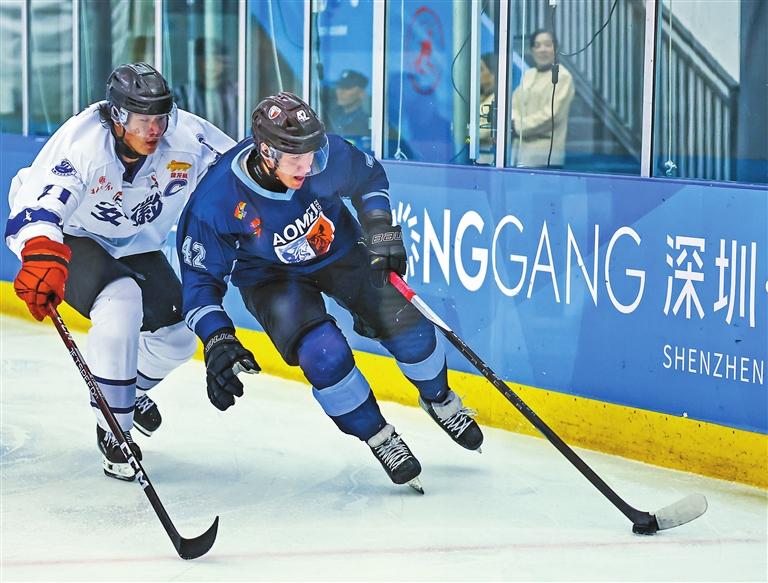 A player from Liaoning Shenyang Aomei Ice Hockey Club (R) contends with an opponent from Anhui Xinhua University Ice Hockey Club at yesterday’s opening game of the Shenzhen division for the 2025–2026 Chinese Men’s Ice Hockey League in Longgang District. Liaoning clinched a 6–3 victory over Anhui in the match. This season’s league is structured across three divisions — Shenyang, Shenzhen, and Qiqihar — and features four domestic professional clubs: Beijing Lions Ice Hockey Club, Anhui Xinhua University Ice Hockey Club, Liaoning Shenyang Aomei Ice Hockey Club, and Shenzhen Kunlun Red Star Ice Hockey Club. Over six days until Dec. 15, the teams will compete in a total of 12 games. The league finals are scheduled to be held in Beijing next March. Liu Xudong |