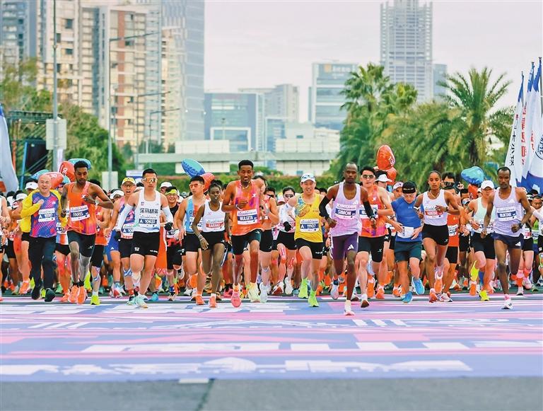 Participants start the race during the 2025 Shenzhen Nanshan Half Marathon yesterday morning. The 21.1-kilometer route started near the east gate of Shenzhen Talent Park and finished at Haide Third Road beside the Shenzhen Bay Sports Center. Ethiopian runners Abduljelil Abdulwokil Faris and Kebebush Yisma Zewoldemariam won the men’s and women’s titles, respectively, breaking the event records with times of 1:01:13 and 1:09:42. Courtesy of Weibo acccount “98Run” |