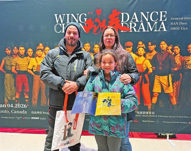 Malika Khouya, an 8-year-old girl, poses with her family while attending a meet-and-greet and autograph session of Shenzhen dance drama “Wing Chun” in Toronto, Canada, on Saturday, local time. Fans from across Canada gathered for two high-energy meet-and-greet and autograph sessions that showcased the production’s cross-cultural reach. P3> Zhang Yu |