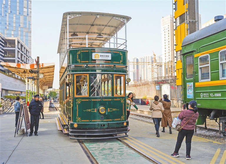 A tourist takes photos of a tram at the decades‑old Shenzhen Industrial Railway Station in Luohu District. Once a crucial logistics hub for agricultural products between the Chinese mainland and Hong Kong, the station ceased operations in 2010. It has since been transformed into a vibrant space that blends a museum, a cultural landmark, and a public leisure area. Today, its preserved old tracks, vintage platforms, and retro train cars — complemented by lush greenery and scenic landscaping — have turned the site into a popular destination where both residents and tourists can delve into the past and capture memorable photos.Yan Wenting |