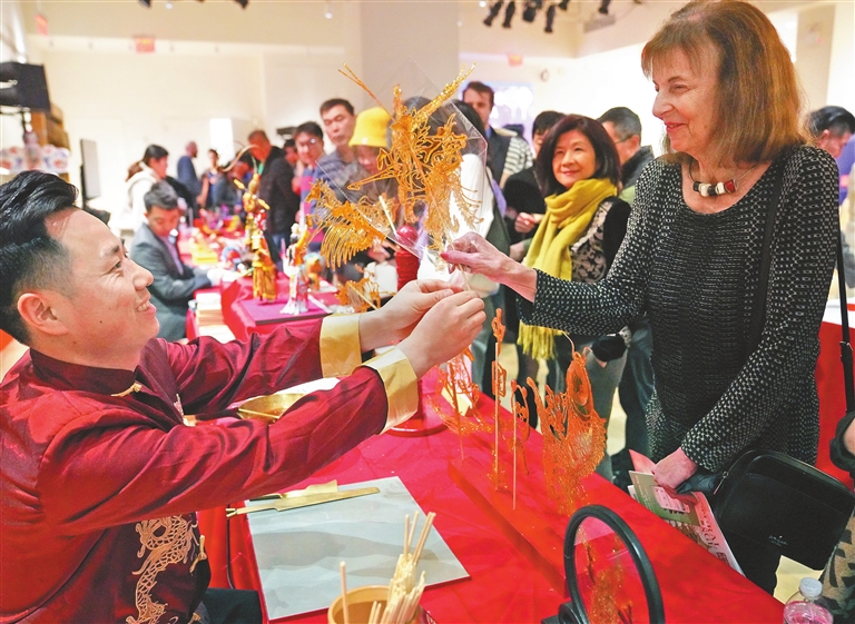 A woman receives a piece of traditional Chinese sugar painting — a folk art created by pouring hot, molten sugar onto a stone slab to form intricate designs — at the “Flavors of China” Spring Festival cultural event in New York on Sunday. The event gathered over 400 Chinese and international guests to enjoy Chinese cuisine, watch intangible cultural heritage demonstrations, and welcome the upcoming Lunar New Year. The “Flavors of China” series will also travel to other U.S. cities including San Francisco and Portland.Xinhua |
