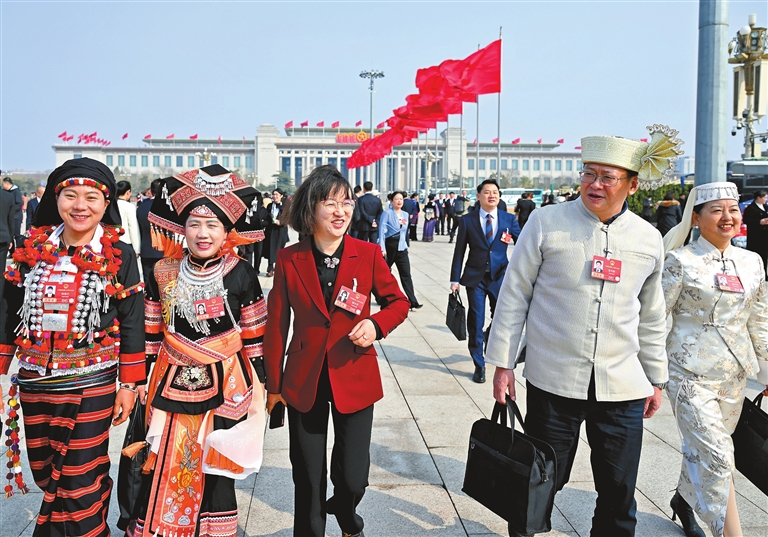 Lawmakers walk toward the Great Hall of the People in Beijing to attend the closing meeting of the annual session of China’s top legislature Thursday. During the meeting, they officially approved the outline of the 15th Five-Year Plan (2026–2030) for national economic and social development. They also voted to adopt the Ecological and Environmental Code, the Ethnic Unity and Progress Promotion Law, and the National Development Planning Law. P4~5> China News Service |