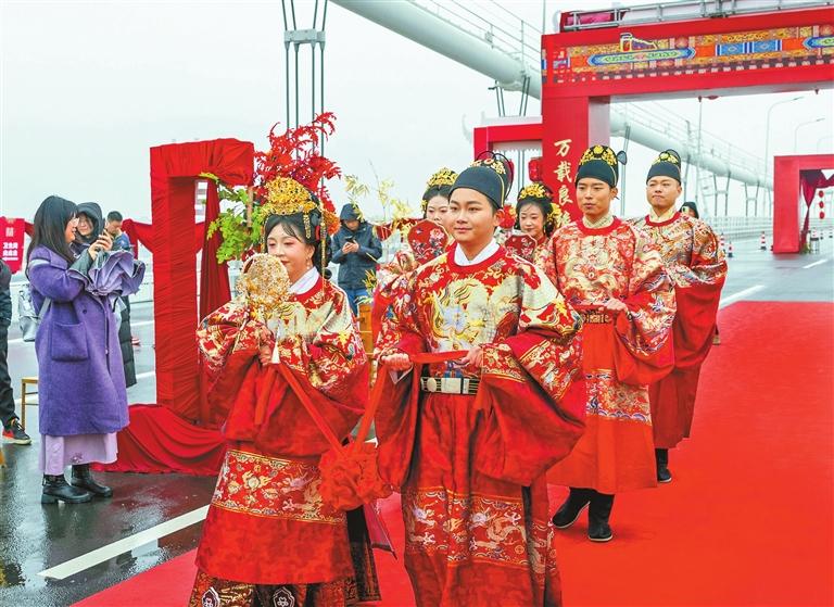 A group wedding takes place at the construction site of the Shuangliu Yangtze River Bridge in Wuhan, capital of central China’s Hubei Province, yesterday. Three couples from the bridge’s construction companies, dressed in traditional Chinese wedding attire, took part in the ceremony. As Wuhan’s 12th bridge across the Yangtze River — China’s longest waterway — the bridge is scheduled to open Friday. It is hailed as the world’s first smart suspension bridge, thanks to its groundbreaking integration of intelligent systems.Xinhua |
