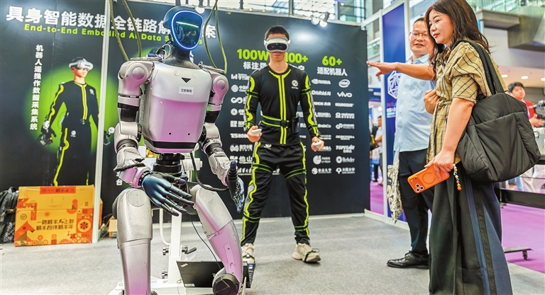 A humanoid robot from Shenzhen-based IO-AI Tech interacts with visitors during the three-day Fair of AI and Robotics (FAIR) plus 2026 at the Shenzhen Convention and Exhibition Center in Futian District on Wednesday. A world-class expo on robotics development and manufacturing technology, the event, which runs through Friday, covers an exhibition area of 15,000 square meters. In 2025, the total output value of Shenzhen’s robotics industry reached a record high of 242.6 billion yuan (US$33.4 billion), according to a white paper released at the fair. Lai Li |