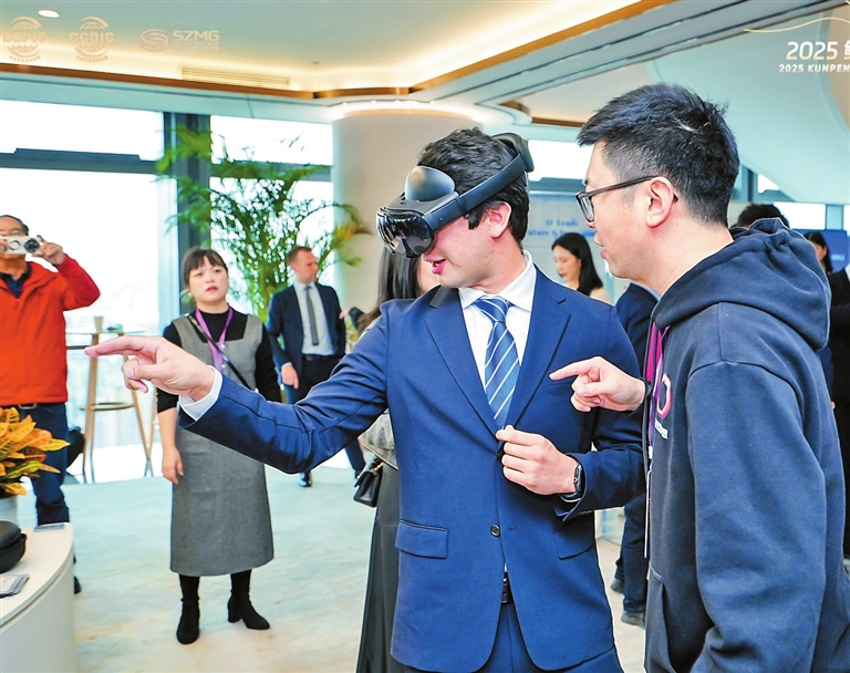 | | Sergio Games (C), from Mexico’s GAMEX Trading Co., tests a pair of AI glasses produced by a Shenzhen company during the 2025 Kunpeng · Autumn Gathering of the Shenzhen Global Business & Trade Networking Conference held at the Sky Museum in Futian District on Thursday. He was among more than 80 guests — diplomats from foreign consulates in Guangzhou and representatives from about 40 institutions and enterprises — who attended the event. |
