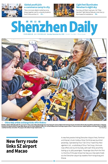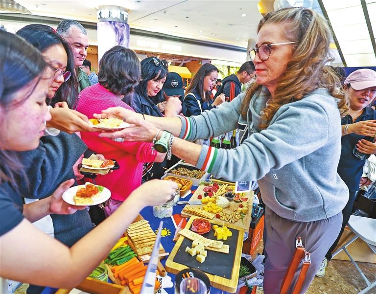 Brazilian volunteer Eledir Busanello (R) serves food to visitors at the Italian Lifestyle Experience Zone during the Chinese/Italian Artists Exchange Program that kicked off at the Baoneng All City mall in Shekou on Saturday.